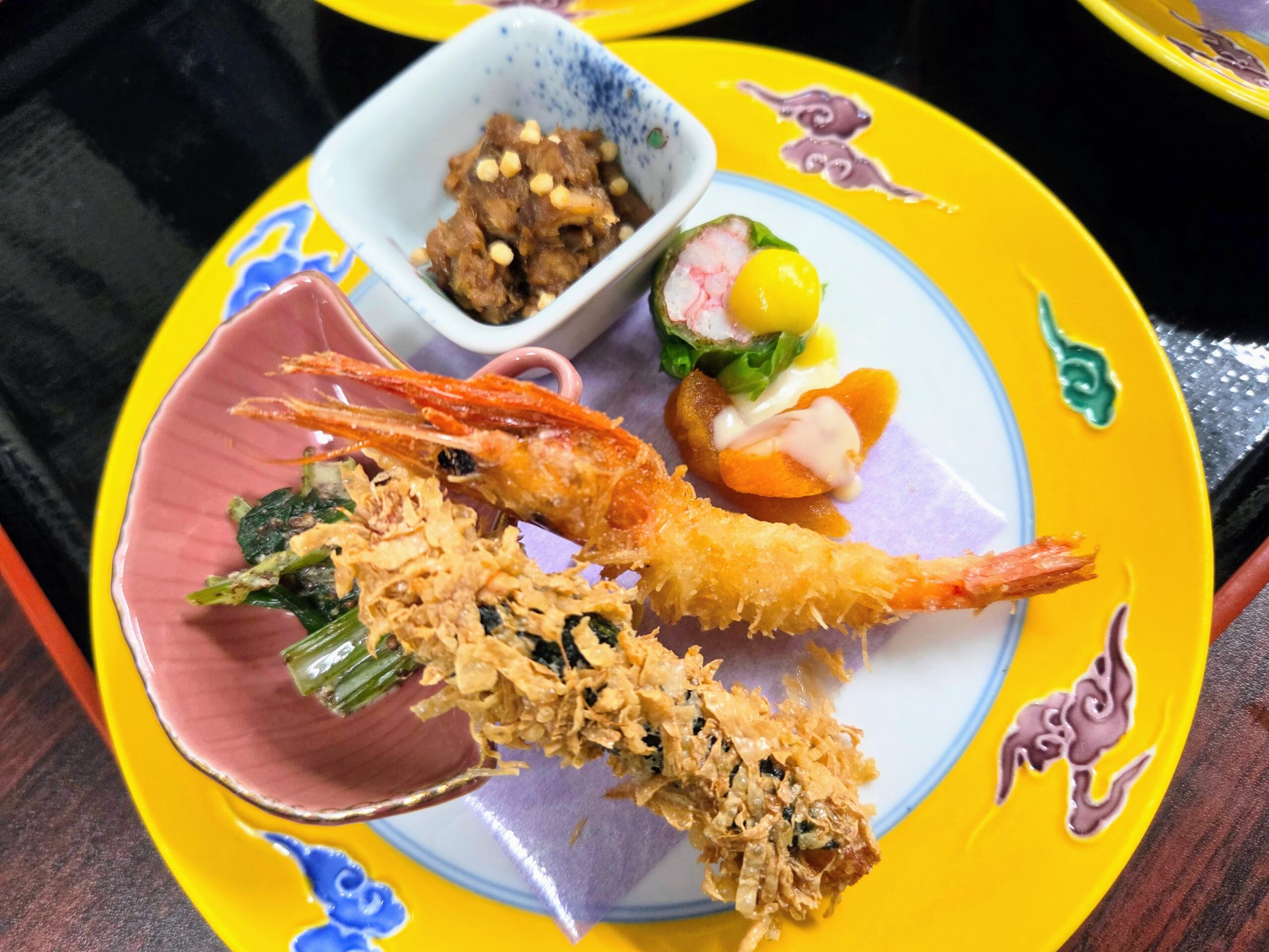 蟹とレタスの昆布巻き、白菜の胡桃和え、あんぽ柿とクリームチーズ、甘海老のカダイフ巻き、鰤しぐれ煮、紅ズワイ蟹の東寺揚げ。