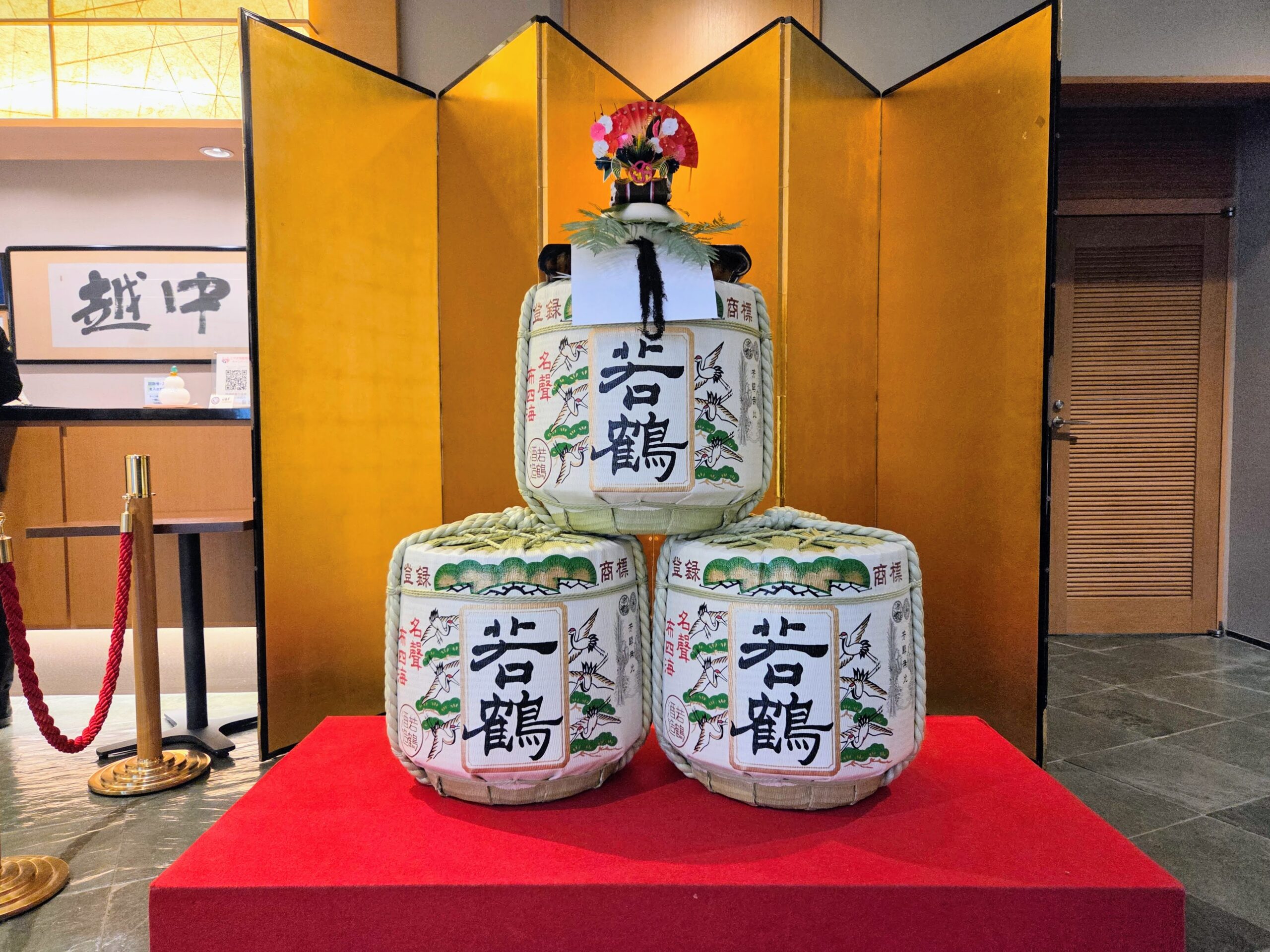 まずフロントカウンター横には鏡餅と若鶴の樽酒を置いております!